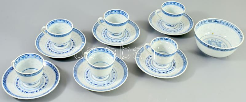 Beschreibung: Kínai rizsszemes 6 darab csésze alátéttel, és egy leveses tál, d: 12 cm