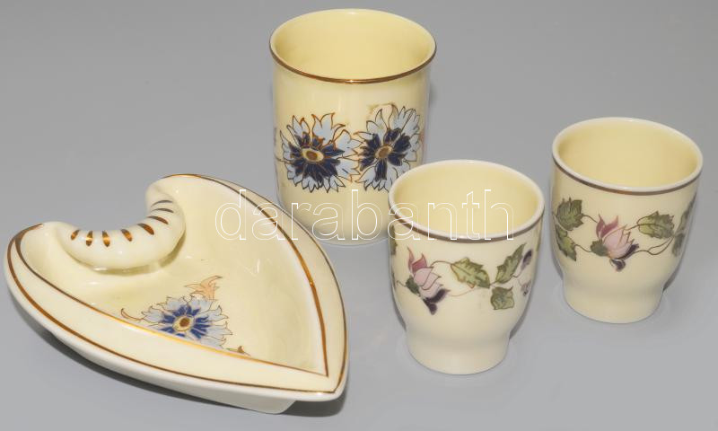 Beschreibung: Zsolnay 3 darab virágmintás pohár + szív alakú búzavirág mintás tálka, jelzett, hibátlan.
