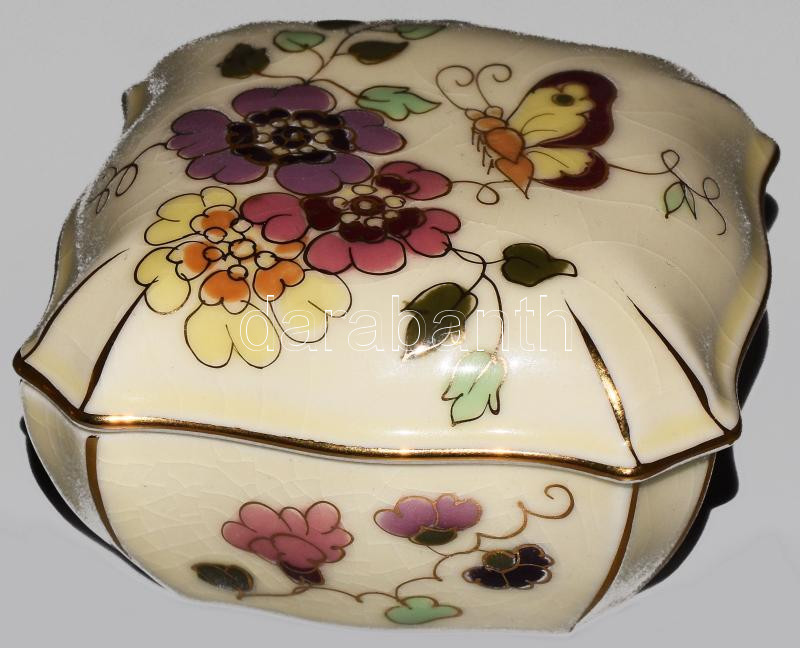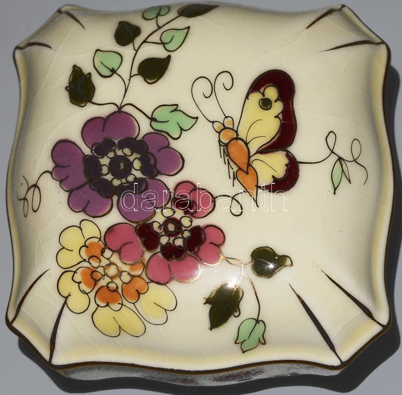 Beschreibung: Zsolnay pillangó mintás bonbonier. Jelzett, hibátlan, 7,5x7,5 cm