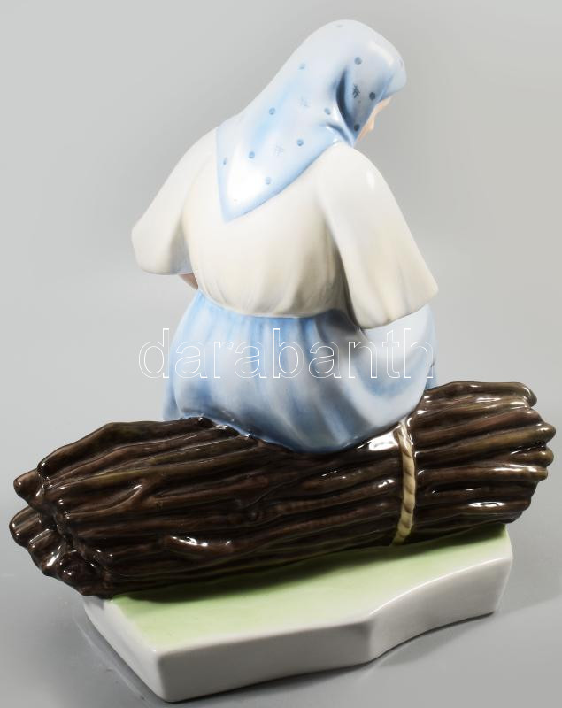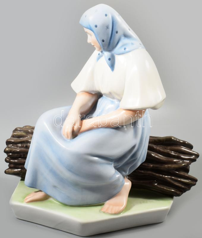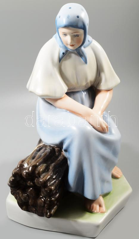 Beschreibung: Zsolnay rőzsén ülő asszony. Terv.: Sinkó András. Kézzel festett, jelzett, hibátlan, m: 27 cm