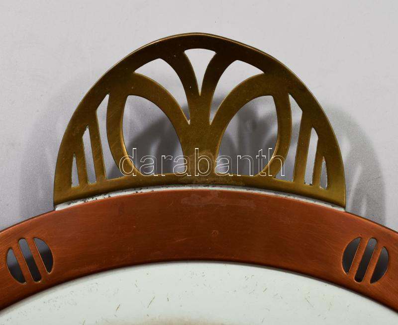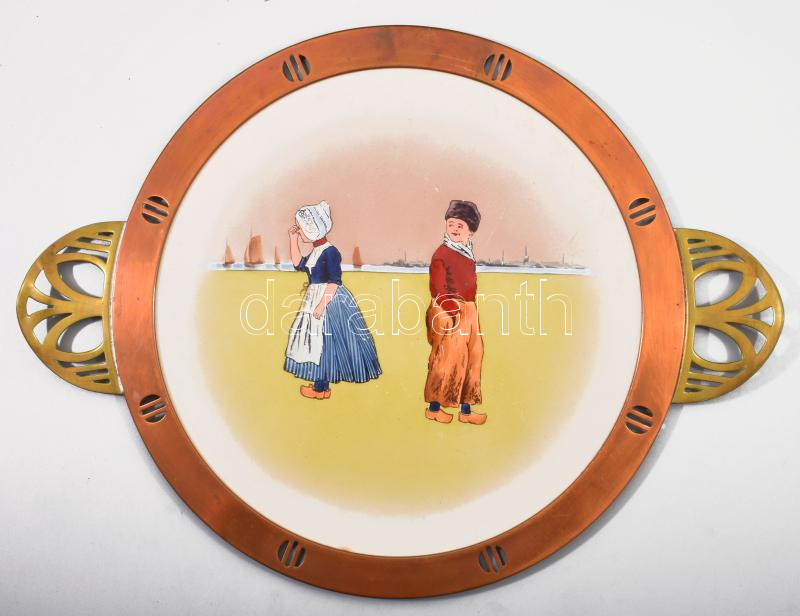 cca 1920 Késő szecessziós holland tortatál, gyermekeket ábrázoló fajansz betét réz szerelékkel és fogóval, számozott, kopással, de jó állapotban, d: 35 cm
