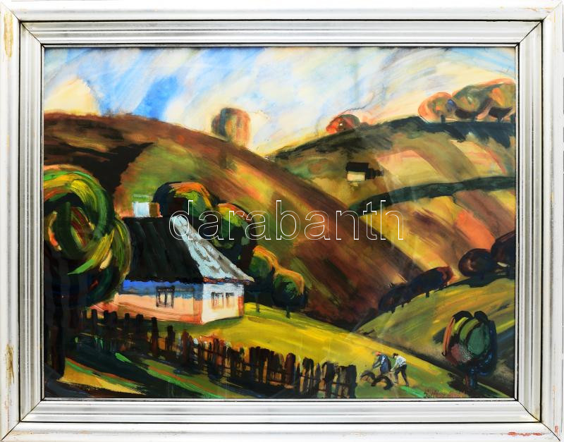 Soltész Albert (1926-2015): Ősz a Beszkidekben (Lengyelország/Poland), 1970-80 körül. Olaj-tempera, papír. Jelezve jobbra lent. Hátoldalán kiállítási raglappal. Üvegezett, dekoratív, kissé sérült fakeretben. . 60x80 cm / oiltempera on paper, signed, framed