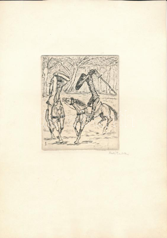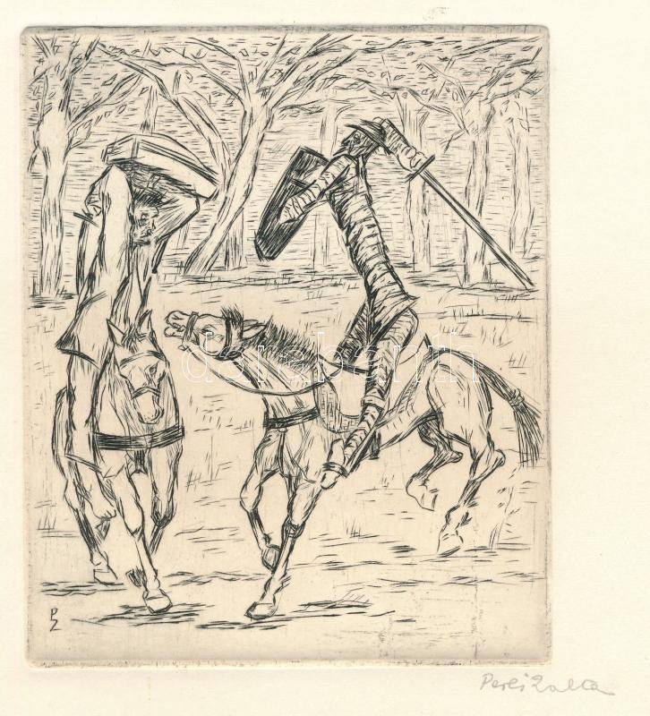 Perei Zoltán (1913-1992): Párbaj (Don Quijote illusztráció), 1949. Rézmetszet, papír, jelzett. Az 1949-ben megjelent Don Quijote de la Mancha élete c. mappából. 12x10 cm. Ritka!