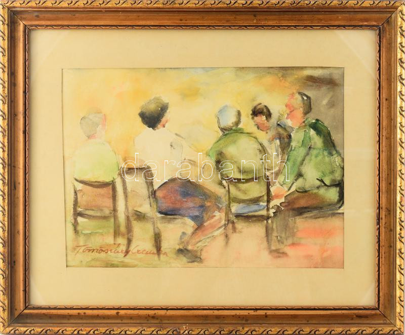 Beschreibung: Tömösváry Béláné Aranka (-), működött a XX. sz. közepén-végén: Társaság. Akvarell, papír, jelzett. Üvegezett, dekoratív fakeretben, 27,5×38,5 cm