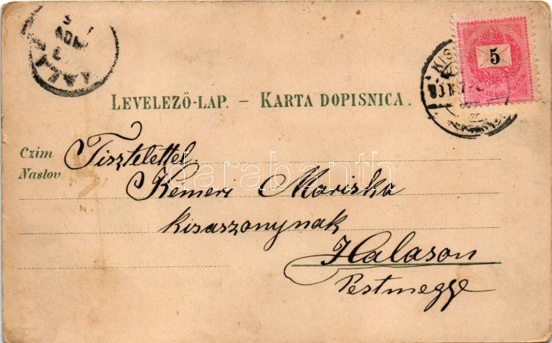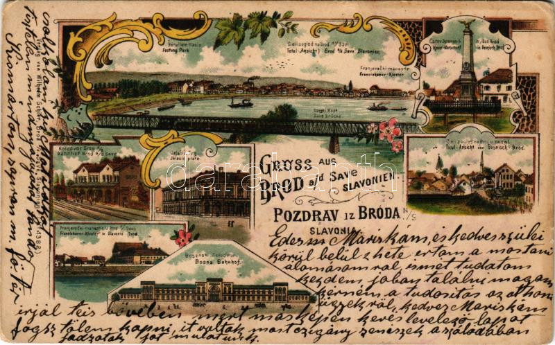 Bród, Brod an der Save, Bosanski Brod; Festung Park, Franciskaner-Kloster, Kaiser Monument, Bahnhof, Save Brücke, Jelacic Platz / Fortress park, Monastery, Railway Station, monument, bridge, locomotive. Wilhelm Schier floral Art Nouveau litho (kis szakadás / small tear)