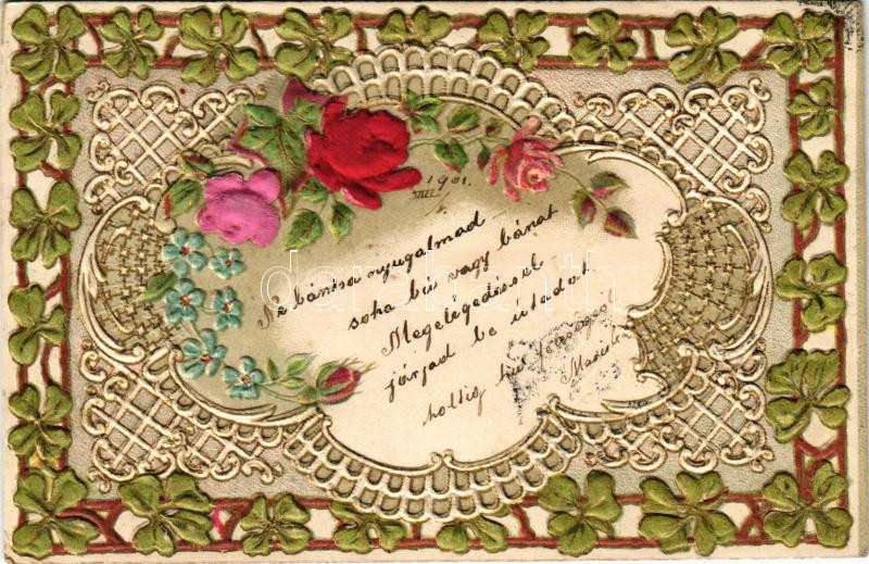 Beschreibung: 1901 Szecessziós-virágos dombornyomott litho üdvözlőlap lóherékkel és selyem rózsákkal / Art Nouveau, floral Emb. litho greeting card with clovers and silk roses (EK)