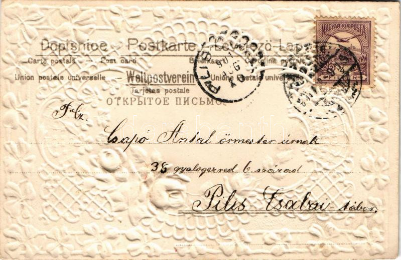 1901 Szecessziós-virágos dombornyomott litho üdvözlőlap lóherékkel és ... https://www.darabanth.com/de/508-Fernauktion/508.0/Ansichtskarten/GruC39Fkarten-Feste~666/1901-Szecesszios-viragos-dombornyomott-litho-udvozlolap-loherekkel-es-selyem-rozsakkal-A~II3442954