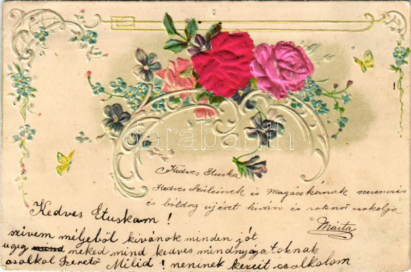 Beschreibung: 1901 Szecessziós-virágos dombornyomott litho üdvözlőlap selyem rózsákkal / Art Nouveau, floral Emb. litho greeting card with silk roses (lyukak / pinholes)