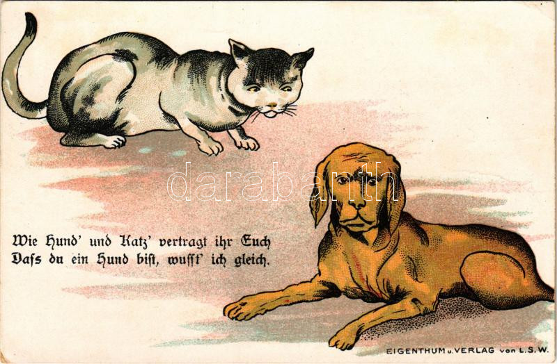 Wie Hund' und Katz' vertragt ihr Euch, dass du ein Hund bist, wusst ich gleich / humour art postcard with cat and dog. Eigentum u. Verlag von L.S.W. litho (EK)