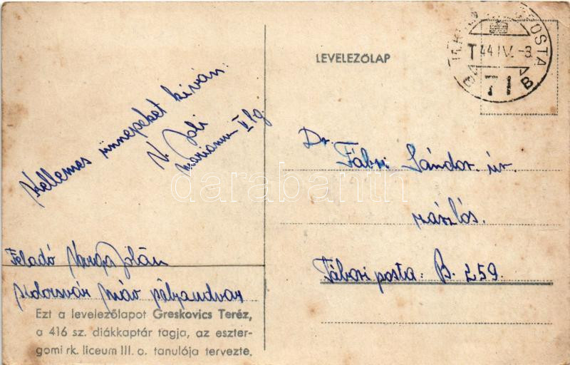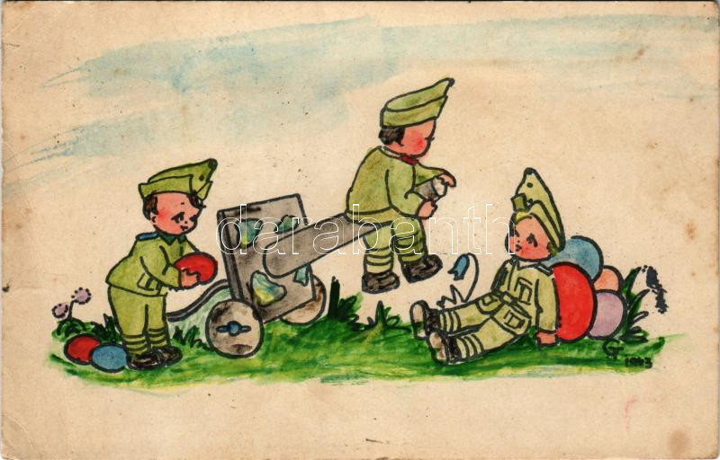 1944 Tüzérek húsvéti tojásokkal. Kézzel festett lap. Ezt a levelezőlapot Greskovics Teréz, a 416. sz. diákkaptár tagja, az esztergomi rk. líceum III. osztályos tanulója tervezte / WWII Hungarian hand-painted military art postcard with Easter greeting + tábori posta (fa)