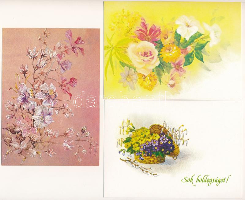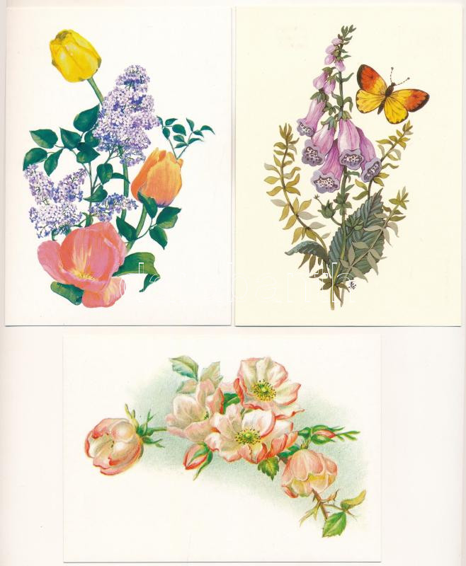 Beschreibung: 30 db MODERN megíratlan díjjegyes grafikus virág motívum képeslap (közte Füzesi Zsuzsa) / 30 modern unused graphic flower motive postcards