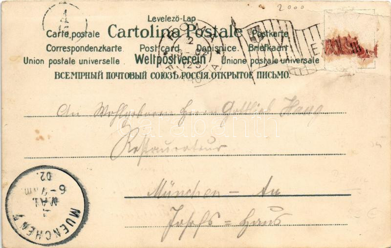 1902 Gruss vom bayerischen Rompilgerzug aus Anlass des 25 jährigen Regierungsjubiläums Sr. Heiligkeit. Papst Leo XIII, Patrona Bavariae ora pro nobis! Verlag der Firma L. Feldle (Augsburg) / Greetings from the Bavarian pilgrimage to Rome on the occasion of the 25th anniversary of reign of His Holiness Pope Leo XIII. Art Nouveau, floral, litho with coats of arms (gyűrődés / tear)