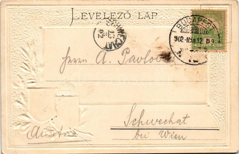 Beschreibung: 1902 Budapest I. Királyi várlak, gőzhajó, címer. Emb. litho (lyuk / pinhole)