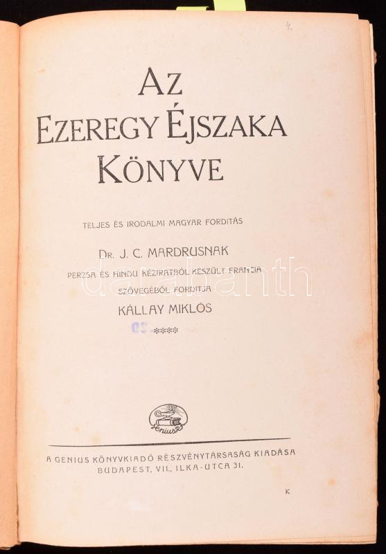 [Mardrus, Joseph Charles]: Az Ezeregy Éjszaka Könyve. Teljes és irodalmi magyar fordítás. Dr. J. C. Mardrusnak perzsa és hindu kéziratból készült francia szövegéből ford.: Kállay Miklós. IV. köt. Számozott, 229./600 példány! Bp., é.n. [1923 és 1928 között], Genius (Jókai-ny.), 2 sztl. lev.+ 350 p.+ 14 (képtáblák) t. Prihoda István, Biczó András, Fáy Dezső és Teuchert Károly egészoldalas rajzaival illusztrálva. Kiadói félvászon-kötés, kissé viseltes borítóval, helyenként kissé foltos lapokkal.