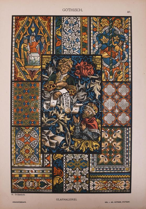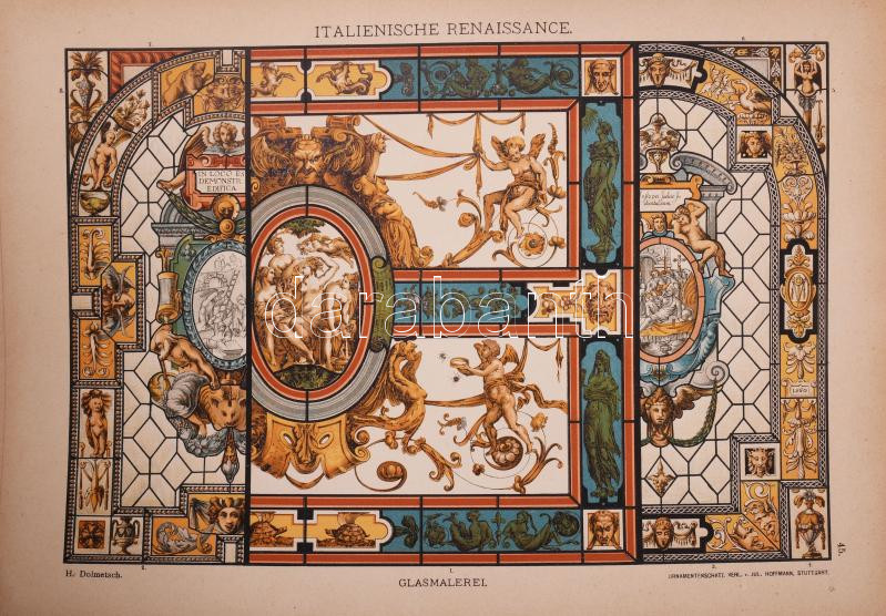 Beschreibung: H. Dolmetsch: Der Ornamentenschatz. [Ein Musterbuch stilvoller Ornamente aus allen Kunstepochen.] Stuttgart, 1888, Jul. Hoffmann. Szórványszámok. Kiadói aranyozott egészvászon kötés, gerinc sérült, széteső állapotban.