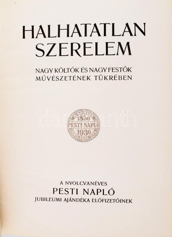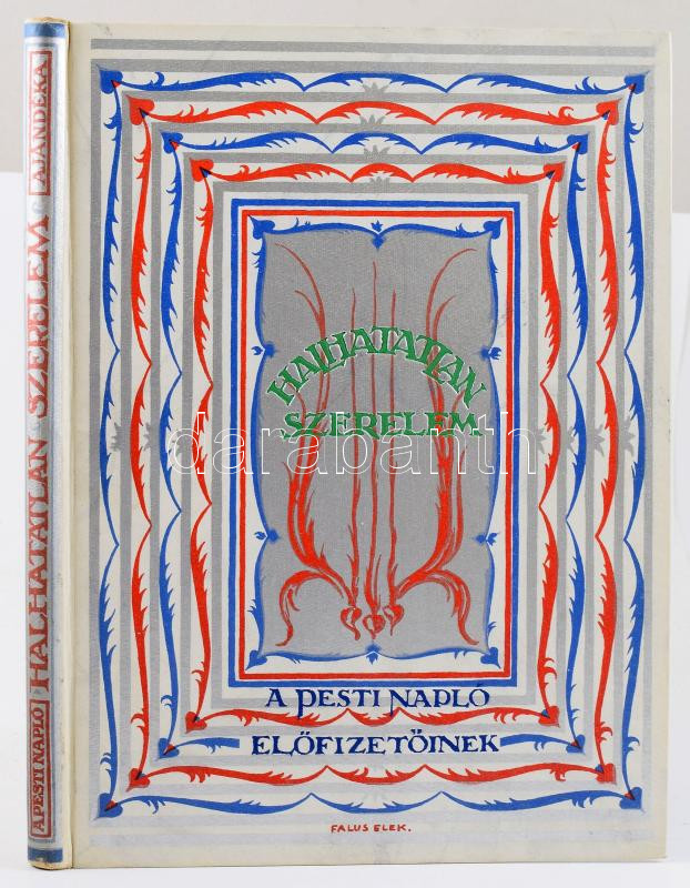 Halhatatlan szerelem. Nagy költők és nagy festők művészetének tükrében. Szerk.: Dr. Mikes Lajos. A nyolcvanéves Pesti Napló ajándéka előfizetőinek. Bp., (1930), Pesti Napló, 143+(1) p.+ 8 (színes) t. Szövegközti és egészoldalas képekkel gazdagon illusztrálva. A borító Falus Elek munkája. Kiadói ezüstözött, festett egészvászon-kötés, jó állapotban, kissé sérült, foltos kartontokban.