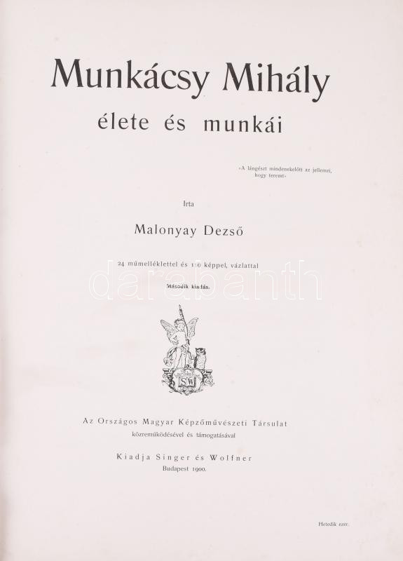 Malonyay Dezső: Munkácsy Mihály élete és munkái. Bp., 1900, Singer és Wolfner, (Hornyánszky-ny.), 8+235+1+8 p.+22 t. 2. kiadás. Szövegközti és egészoldalas képekkel gazdagon illusztrálva. Kiadói dúsan aranyozott egészvászon-kötés, kopott borítóval, kissé sérült gerinccel, kissé sérült kötéssel, a rézkarc és egy tábla (Judith: "Milton" álló alakja.)
