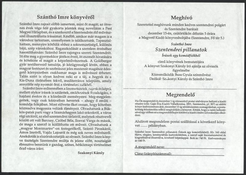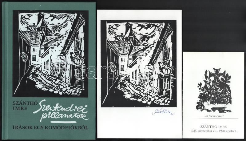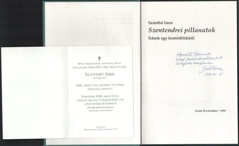 Szánthó Imre: Szentendrei pillanatok. Írások egy komódfiókból. A szerző, Szánthó Imre (1925-1998) festő, grafikus, Szentendre díszpolgára által dedikált példány. [Szentendre], 1994, Gaján Éva, 138+(6) p. A szerző rajzaival és linómetszeteivel illusztrálva. Kiadói kartonált papírkötés. + Szánthó Imre aláírt linómetszete, könyvbemutatójának meghívója, valamint gyászjelentése