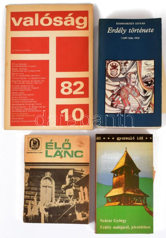 3 db Erdély témájú könyv - Szamosközy István: Erdély története; Élő lánc; Száraz György: Erdély múltjáról, jelenidőben. Kiadói papírkötés, kötetenként változó állapotban. + 1982 Valóság 10. szám, benne Száraz György cikke