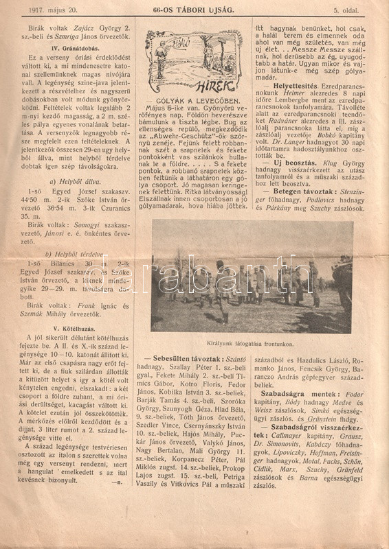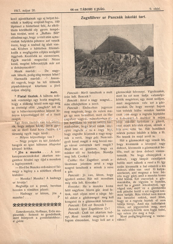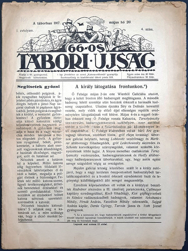 Az ungvári magyar királyi 66. gyalogezred katonáit ungvári és kárpátaljai magyar, szlovák és ruszin lakosokból sorozták. Szövegközti felvételekkel, rajzokkal illusztrált magyar nyelvű tábori újságunk emlékezetes képet ad a 66-osok kiképzéséről, tábori életéről és hadi bevetéseiről. A legfrissebb ezredhíreket, gyakorlatozási versenyhíreket, szabadságolási és sérülési híreket közzé tevő lapszám névanyaga arra enged következtetni, hogy gyalogezredünk valóban többnemzetiségű volt, vezényleti nyelve pedig feltehetően vegyesen magyar és német nyelvű lehetett. Lapszámunk igen emlékezetes, ízes tájnyelven írt humoreszkje a gáztámadás elleni kiképzéssel kapcsolatos jelenet, amelyből a komoly téma ellenére a derű levegője árad. A teljes lapterjedelemből csupán egyetlen cikk foglalkozik közvetlenül a háborúval, a többi írás tábori jeleneteket rögzít, baka anekdotákat oszt meg. Lapszámunk végén részben tréfás, részben komolynak szánt házassági apróhirdetések.