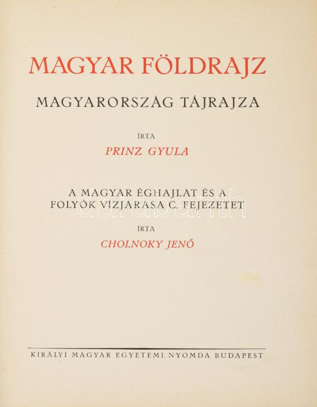 Prinz Gyula: Magyar földrajz. Magyarország tájrajza. A magyar éghajlat és a folyók vízjárása c. fejezetet írta Cholnoky Jenő. Bp., Királyi Magyar Egyetemi Nyomda. Félbőr kötés, gerinc és kötéstábla sérült, kopottas állapotban.