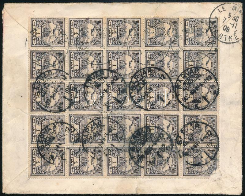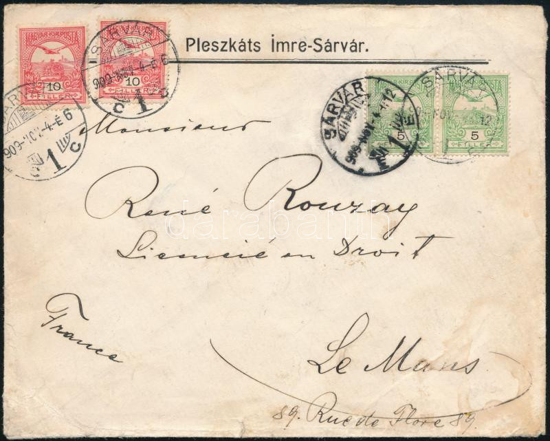 Beschreibung: 1909 Levél Franciaországba Turul 2 x 5f + 2 x 10f + 1f 25-ös tömb bérmentesítéssel