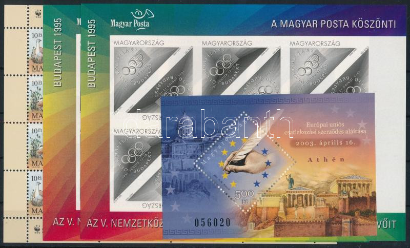 Kis tétel stecklapon, benne 1994 Veszélyeztetett állatok teljes ív + 1995 Olypiafila 2 db vágott feketenyomat kisív + 2003 Európai uniós csatlakozási szerződés aláírása blokk