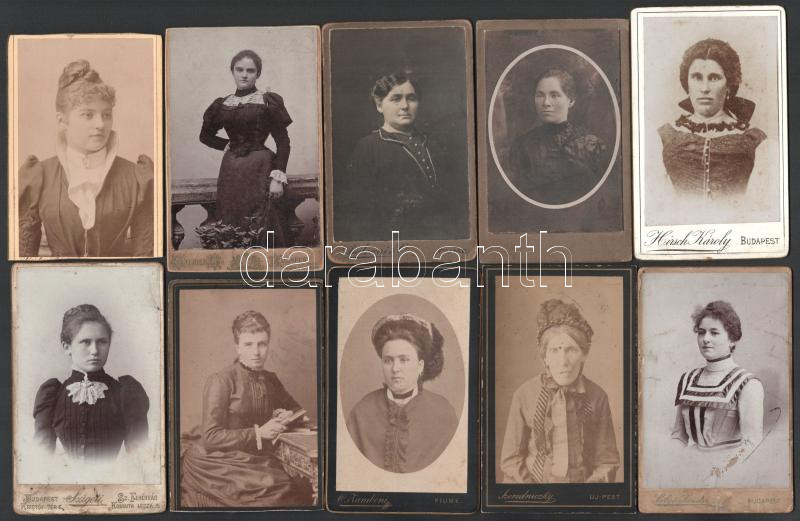 10 db hölgyeket ábrázoló vizitkártya, különféle műtermekből (közte Egey István, Debrecen; Berky Dezső, Szatmár; Carlo Zamboni, Fiume; stb.), változó állapotban