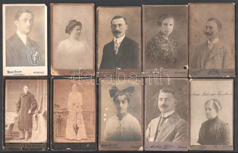 Beschreibung: 10 db vizitkártya miskolci műtermekből (Zureich Károly, Büdy Gyula, Barna Hugó, Ábrahám István), változó állapotban, közte sérült