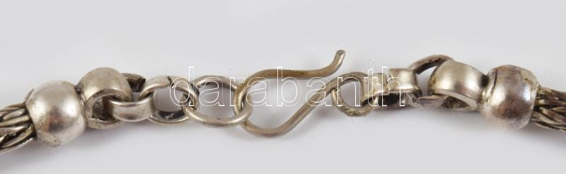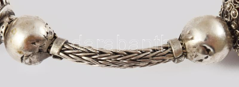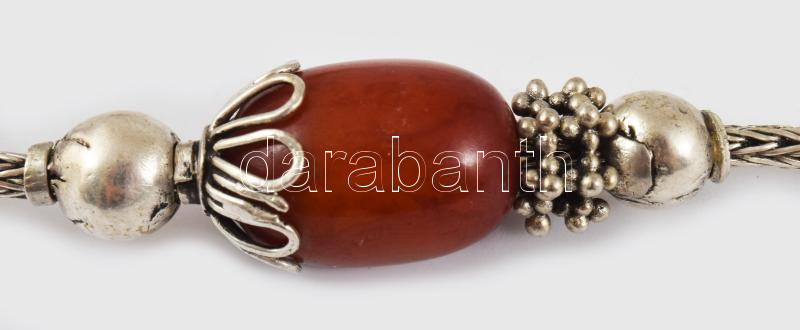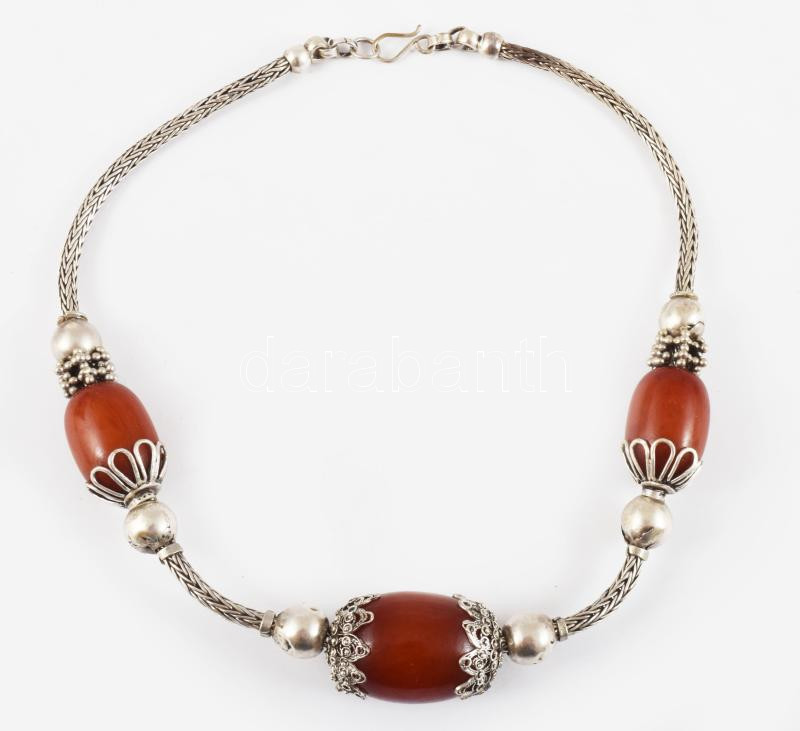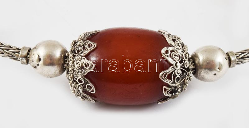 Nyakék. Jemen, 20. sz. első fele, zsidó ötvösmesterek munkája, 3 darab ovális csiszolású vörös kopál szem fém és ezüsttartalmú filigrán díszítéses szerelékkel, h: 40 cm