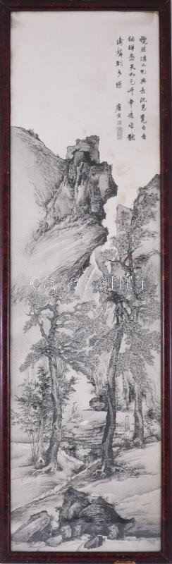 Beschreibung: Olvashatatlan jelzéssel, kínai alkotó, XX. sz. közepe: Alakok a tájban. Selyemkép. Foltos. Üvegezett fakeretben. 89×25 cm