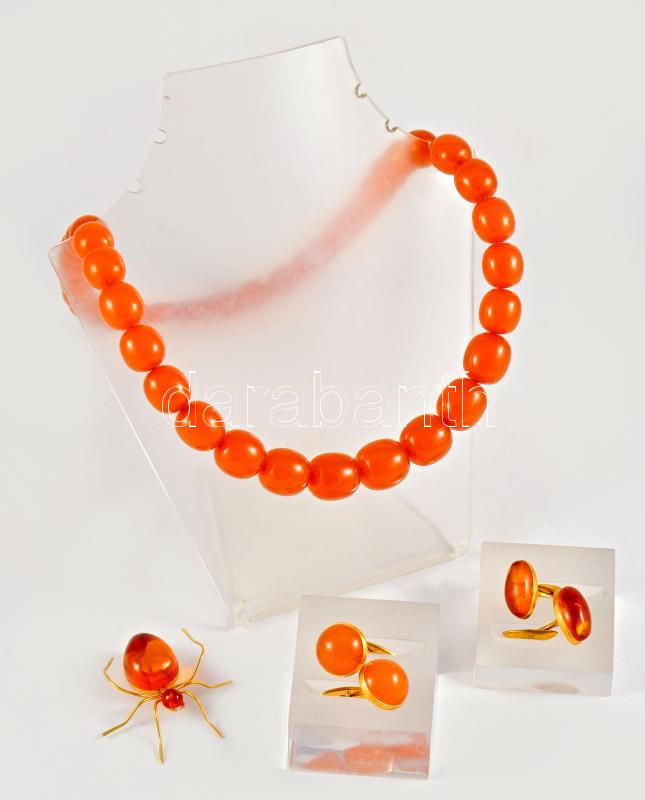 Beschreibung: 4 darab borostyán ékszer, mandzsetta pár, nyaklánc, pók alakú bross.