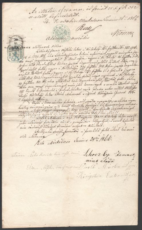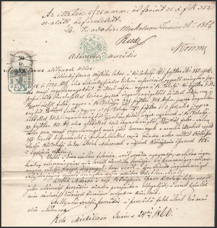 Beschreibung: 1866 Kistokaji földrészlet adásvételi szerződése 50kr illetékbélyeggel