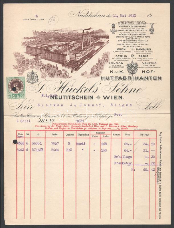 1912 Neutitschein (Nový Jičín), J. Hückel's Söhne fejléces számla... https://www.darabanth.com/de/508-Fernauktion/508.0/Kunst-Dokumente-andere-Sammelgebiete/Dokument~679/1912-Neutitschein-NovC3BD-JiC48Din-J-Huckels-Sohne-fejleces-szamla-a-gyar-latkepevel~II3435939