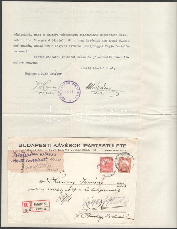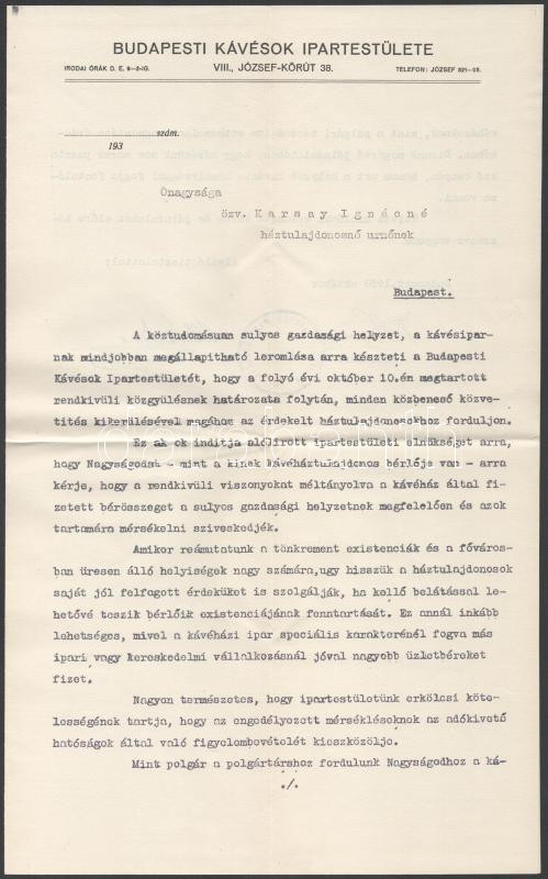 1930 A Budapesti Kávésok Ipartestülete gépelt levele háztulajdonoshoz, arra kérve őt, hogy a házában működő kávéház bérleti díját mérsékelje, mivel a nagy gazdasági világválság nyomán a kávéházak is nehéz anyagi helyzetbe kerültek, eredeti borítékjában, postán elküldve, szép állapotban
