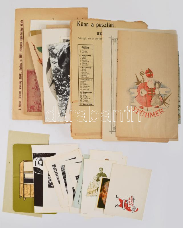77 db-os papírrégiség csomag 1884- /1902-es levél, 1884-es Brahms hangverseny meghívó, Stühmer mikulás zacskó, TIT tagsági bélyegekkel, fotók, színészképek, 46-os naptár, postai levlapok, üdvözlőkártyák, szentképek, csoki és édességpapírok, lithók, címkék, tusrajz, lithó gyűjtőkártyák, ex librisek, iskolai takarékbélyeg gyűjtőlap, stb
