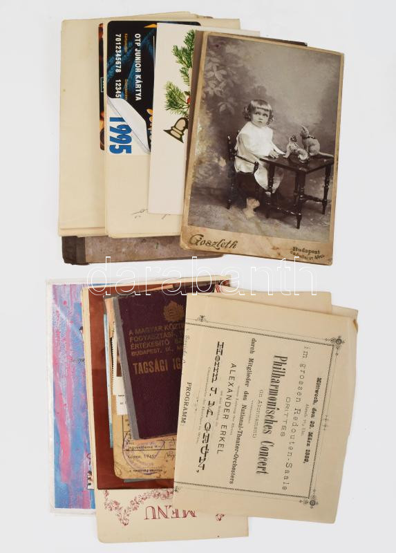 PapÃrrégiség csomag, 1901-es munkakönyv viaszpecséttel, okmánybélyeggel, menükártya, meghÃvó, üdvözlÅ‘kártyák, Goszleth kemény hátú gyerekfotó, fotók, naptárak, litho matricák, üdvözlÅ‘kártyák, képeslapok, 1882-es koncert program, 1910-es évekbÅ‘l okmánybélyeges iskolai bizonyÃtványok