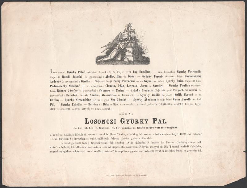 1859 Pest, losonczi Gyürky Pál (1783-1859) cs. kir. val. belső titkos tanácsos és kamarás, Krassó megye volt főispánjának halotti értesítője, kis lapszéli sérülésekkel, 23,5x31 cm