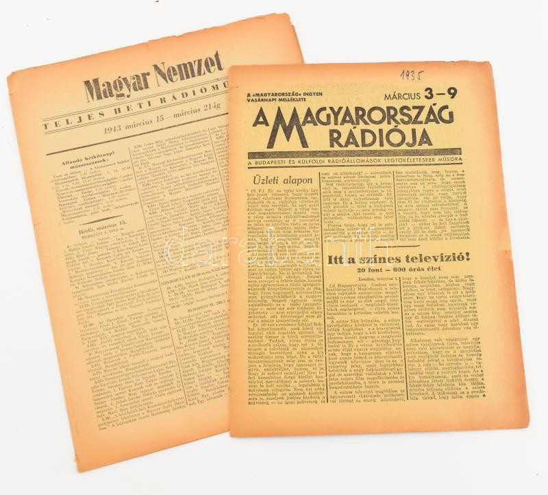 1935, 1943 A Magyarország Rádiója és a Magyar Nemzet 1-1 száma https://www.darabanth.com/de/508-Fernauktion/508.0/Kunst-Dokumente-andere-Sammelgebiete/Drucksachen~852/1935-1943-A-Magyarorszag-Radioja-es-a-Magyar-Nemzet-1-1-szama~II3415265