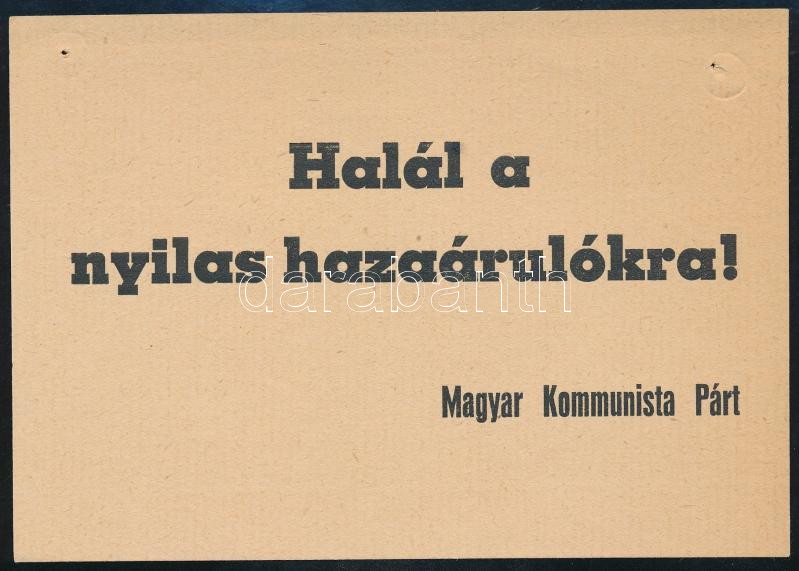 1945 "Halál a nyilas hazaárulókra" - a Magyar Kommunista Pár... https://www.darabanth.com/de/508-Fernauktion/508.0/Kunst-Dokumente-andere-Sammelgebiete/Drucksachen~852/1945-Halal-a-nyilas-hazaarulokra-a-Magyar-Kommunista-Part-szorolapja-jo-allapotban~II3442033