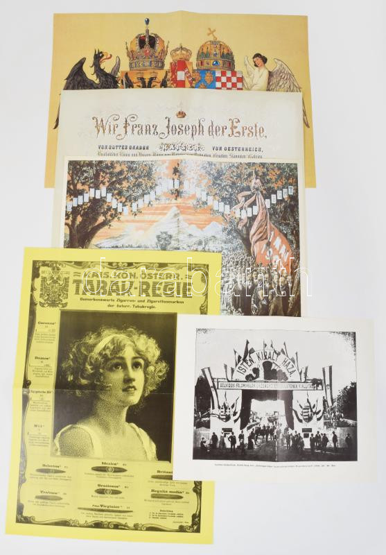 A Délvidéki Földmívelők Gazdasági Egyesületének kiállítása bejárata 1901-ben, fekete-fehér nyomat, 24x29,5 cm + Az Osztrák-Magyar Monarchia címerét, korabeli oklevelet és reklámokat ábrázoló reprint nyomtatványok, 4 db, változó méretben