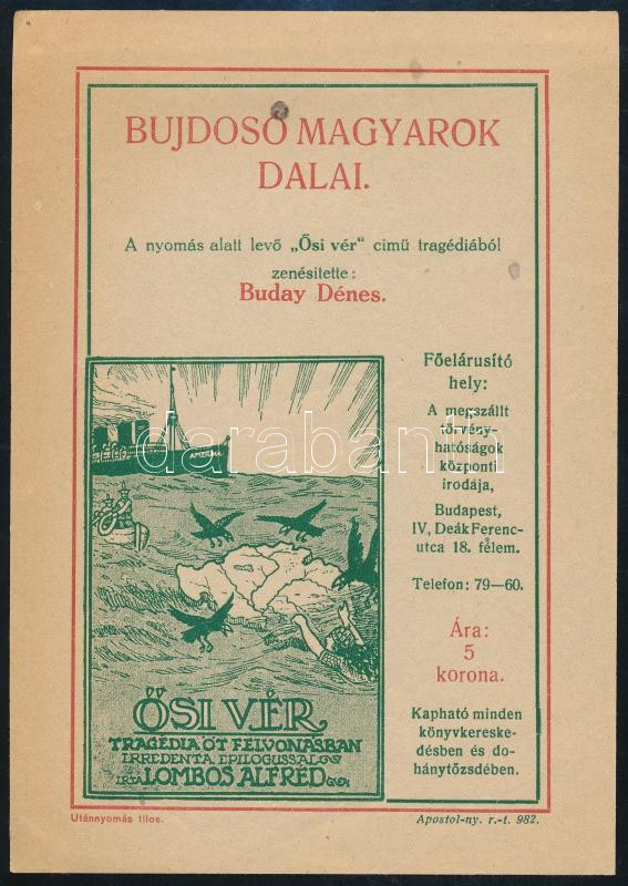 cca 1920 Irredenta szórólap az "Ősi vér" tragédiából készített Bujdosó magyarok dalai c. zenemű megjelenéséhez, dekoratív kiadvány, jó állapotban