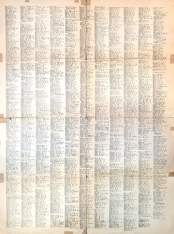 A hajtások mentén gyűrődések és szakadások, hátoldalán javítások, a lapszéleken halvány foltosságok. Térképünk a függőleges hajtás mentén kettévált.