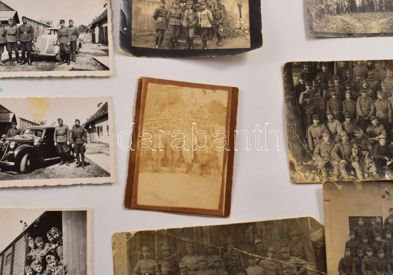 Szép I. és II. világháborús militária tétel 10 db katonai fotó, benne csoportképek, házasúló katonák, hozzá házassági engedély, valamint kapcsolódó iratok