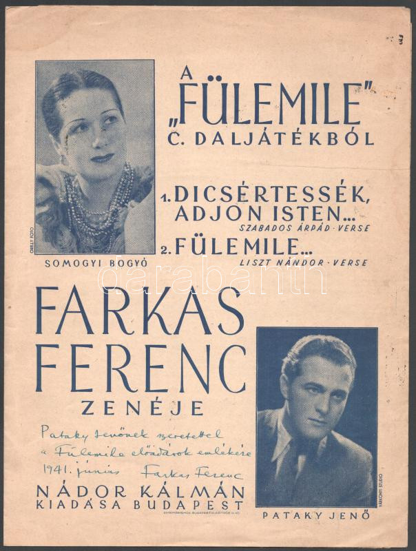 1941 A ,,Fülemile" c. daljátékból 1. Dicsértessék, adjon Isten... 2. Fülemile... Farkas Ferenc zenéje. Farkas Ferenc (1905-2000) kétszeres Kossuth-díjas és Erkel Ferenc-díjas zeneszerző által Pataky Jenő (1914-1996) színész részére dedikált (,,Pataky Jenőnek szeretettel a Fülemile előadások emlékére 1941. június Farkas Ferenc"). Bp., Nádor Kálmán, 4 p. Kisebb sérülésekkel.