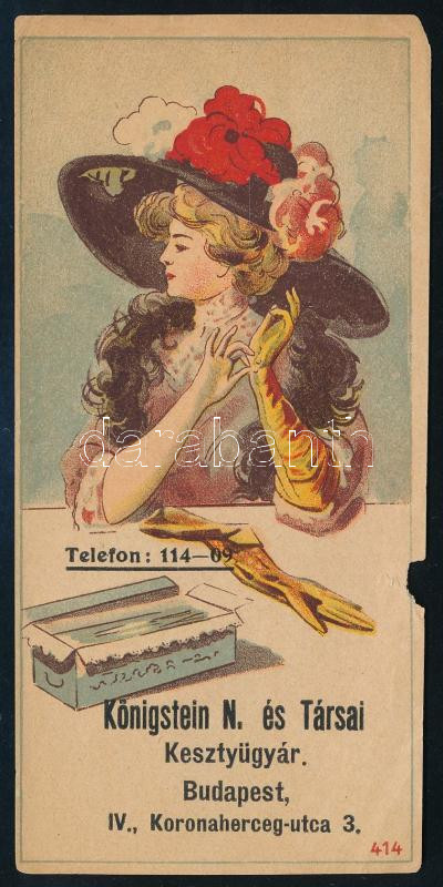 Königstein N. és Társai kesztyűgyár litho számolócédula, lapszéli hián... https://www.darabanth.com/de/508-Fernauktion/508.0/Kunst-Dokumente-andere-Sammelgebiete/Werbungen~684/Konigstein-N-es-Tarsai-kesztyugyar-litho-szamolocedula-lapszeli-hianyokkal~II3437515