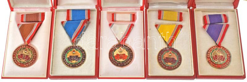 1965. "Szolgálati Érdemérem - A Haza Fegyveres Szolgálatában" 10, 15, 20, 25 és 30 év után műgyantás bronz kitüntetések mellszalagon, szalagsávval, eredeti tokban (5xklf) T:AU-VF, zománchiba