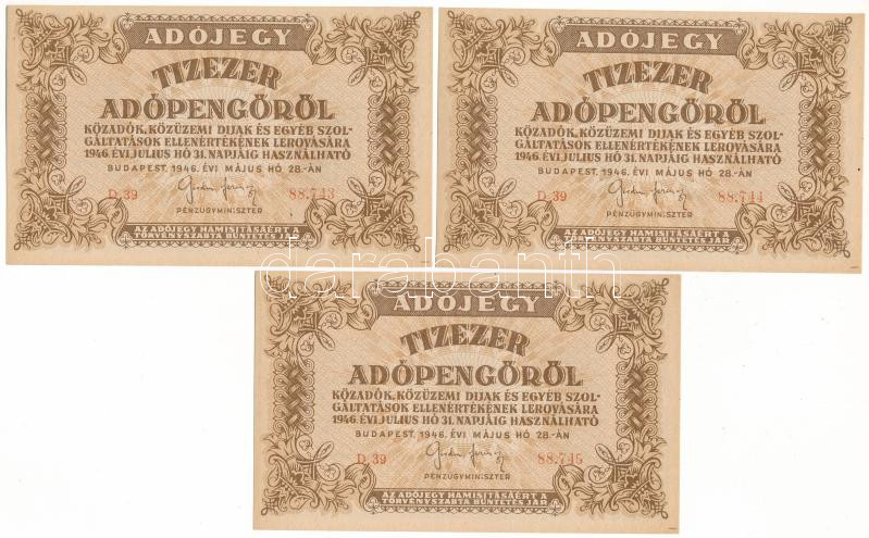 1946. 10.000AP (3x) sorszámkövetők, vízjeles papíron "D 39 88.743... https://www.darabanth.com/de/508-Fernauktion/508.0/Numismatik/Ungarische-Banknoten~835/1946-10000AP-3x-sorszamkovetok-vizjeles-papiron-D-39-88743-D-39-88745-TAU-Adamo-P49~II3438061