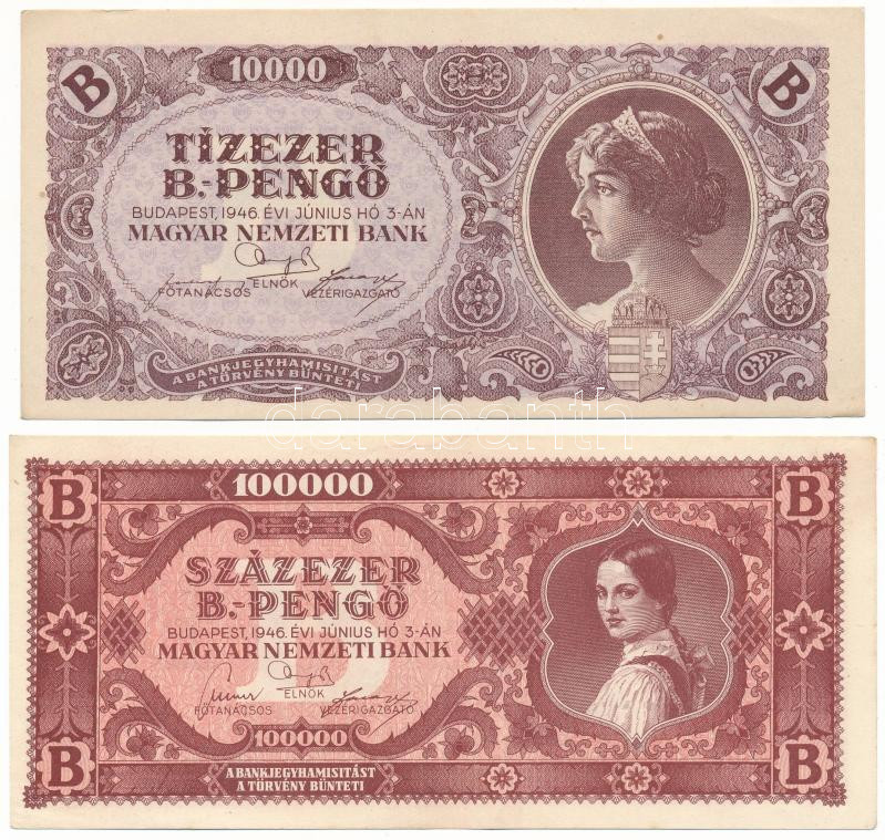 Adamo P35, P36 https://www.darabanth.com/de/508-Fernauktion/508.0/Numismatik/Ungarische-Banknoten~835/1946-10000BP-plus-100000BP-TXF-F-szep-papir3Cbr-3E-Adamo-P35-P36~II3439977