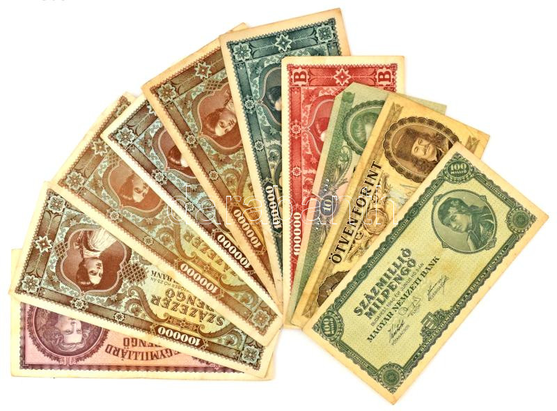 Beschreibung: Vegyes, 9db-os Pengő és Forint bankjegytétel T:F,VG